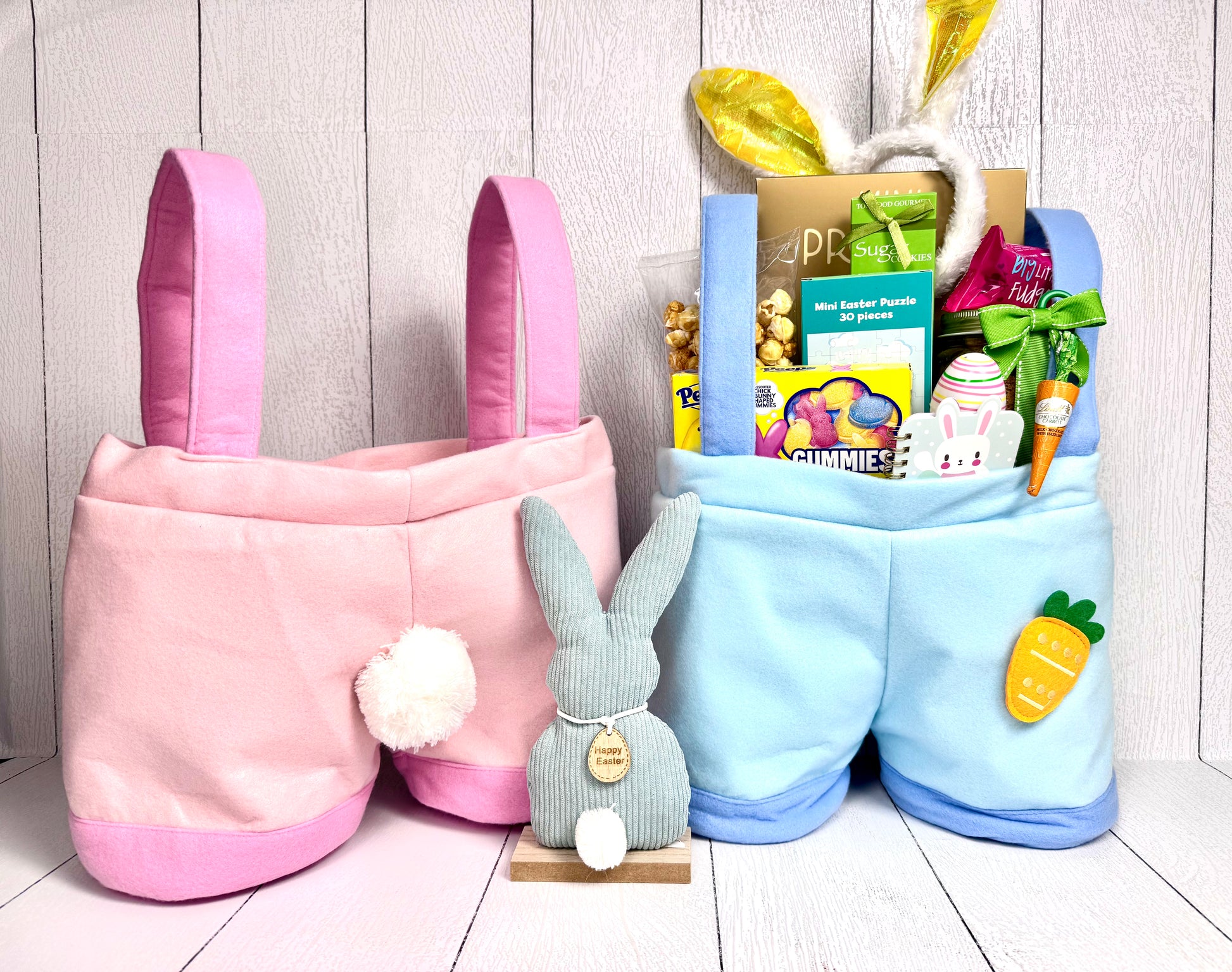 These felt bunny pants make the perfect gift for anyone! They come in pink and blue, carrot on the front and tail on the back! It is filled with a puzzle, bunny notebook, cookies, peeps, fudge, pretzels, popcorn and a bunny ear headband. Pants come in pink and blue!