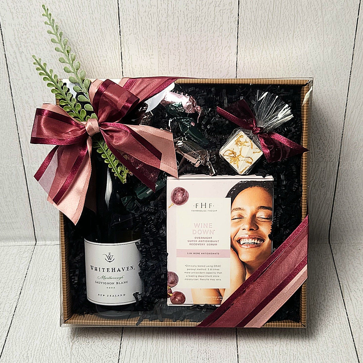 Unwind with the ultimate self-care trio. Wine Down & Relax brings together a luxurious face serum to pamper your skin, a crisp bottle of wine to sip and savor, and decadent gourmet chocolates to indulge your taste buds.